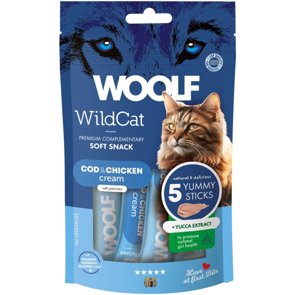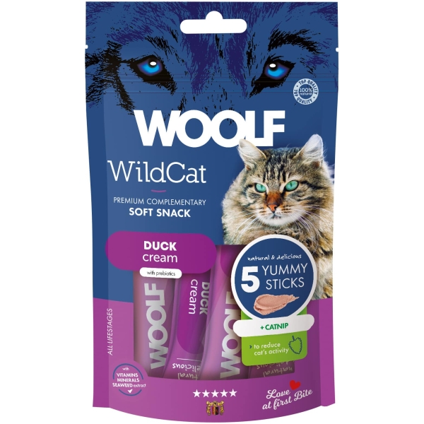 Woolf Wildcat Cat Cream med and, laks og oligosaccharider er en cremet godbid, der kombinerer en lækker smag med høj kvalitet. Oligosaccharider kan hjælpe og have en positiv effekt på din kats fordøjelse og tarmsundhed. Den bløde konsistens gør den perfekt som belønning, som topping på foder – eller direkte fra tuben for et hyggeligt øjeblik, mellem dig og din kat.